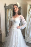 A-line V-Neck Lantern Sleeve Lace Appliques Wedding Lace Up Back Formal Bride Gowns OKV35