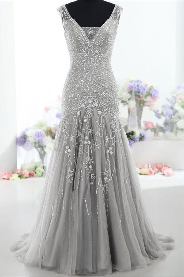 Modest Silver V-neck Long Mermaid Lace Up Prom Evening Dress K170