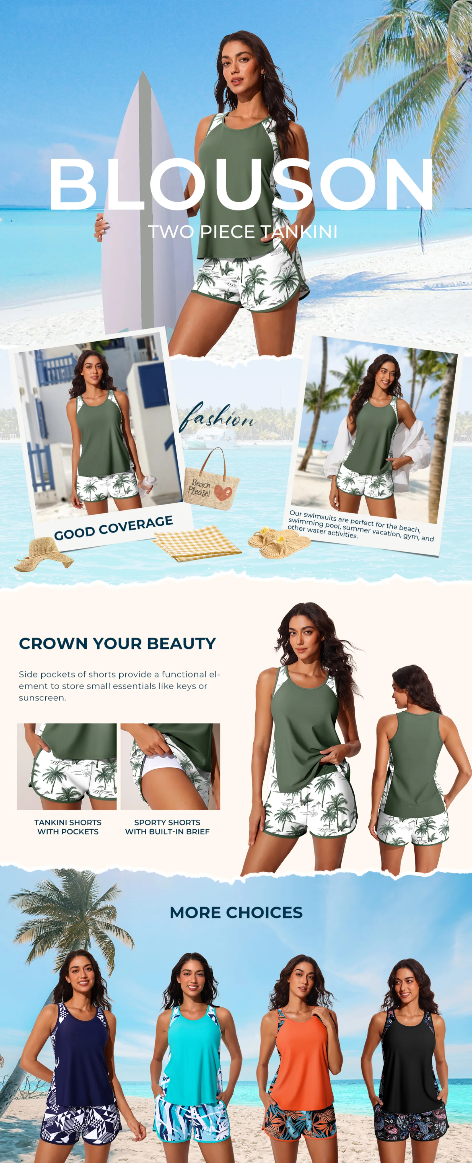 Blouson Tankini Swimsuits for Women Tummy Control Two Piece Bathing Suits with Sporty Pockets Swim Shorts